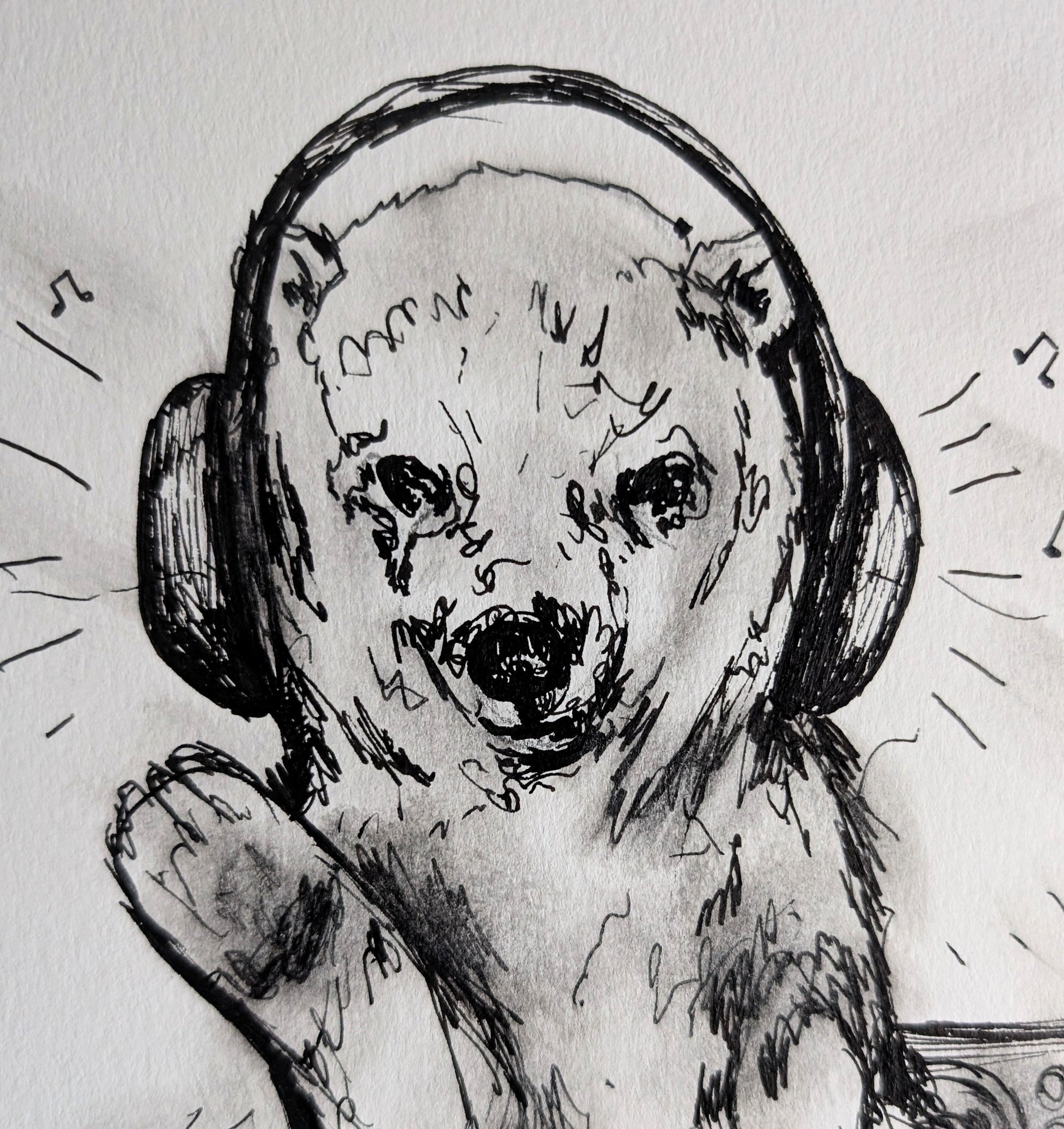 DJ Polar Bear With Headphones Sound Lines Pen Drawing Illustration Sketch Art Portrait Unframed A4 Size Animal Portraiture