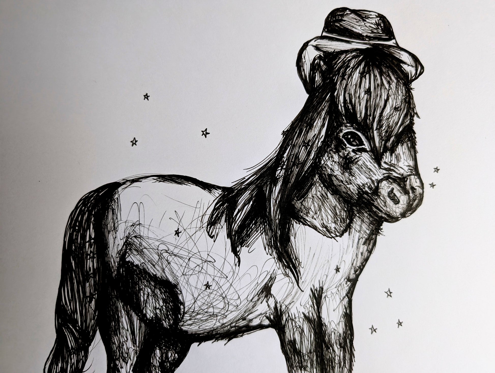 Ride into the wild west with this unique pen illustration of a pony wearing a cow boy hat and surrounded by stars. This A4 size drawing makes for a playful addition to any home or office decor. (Yee-haw!)