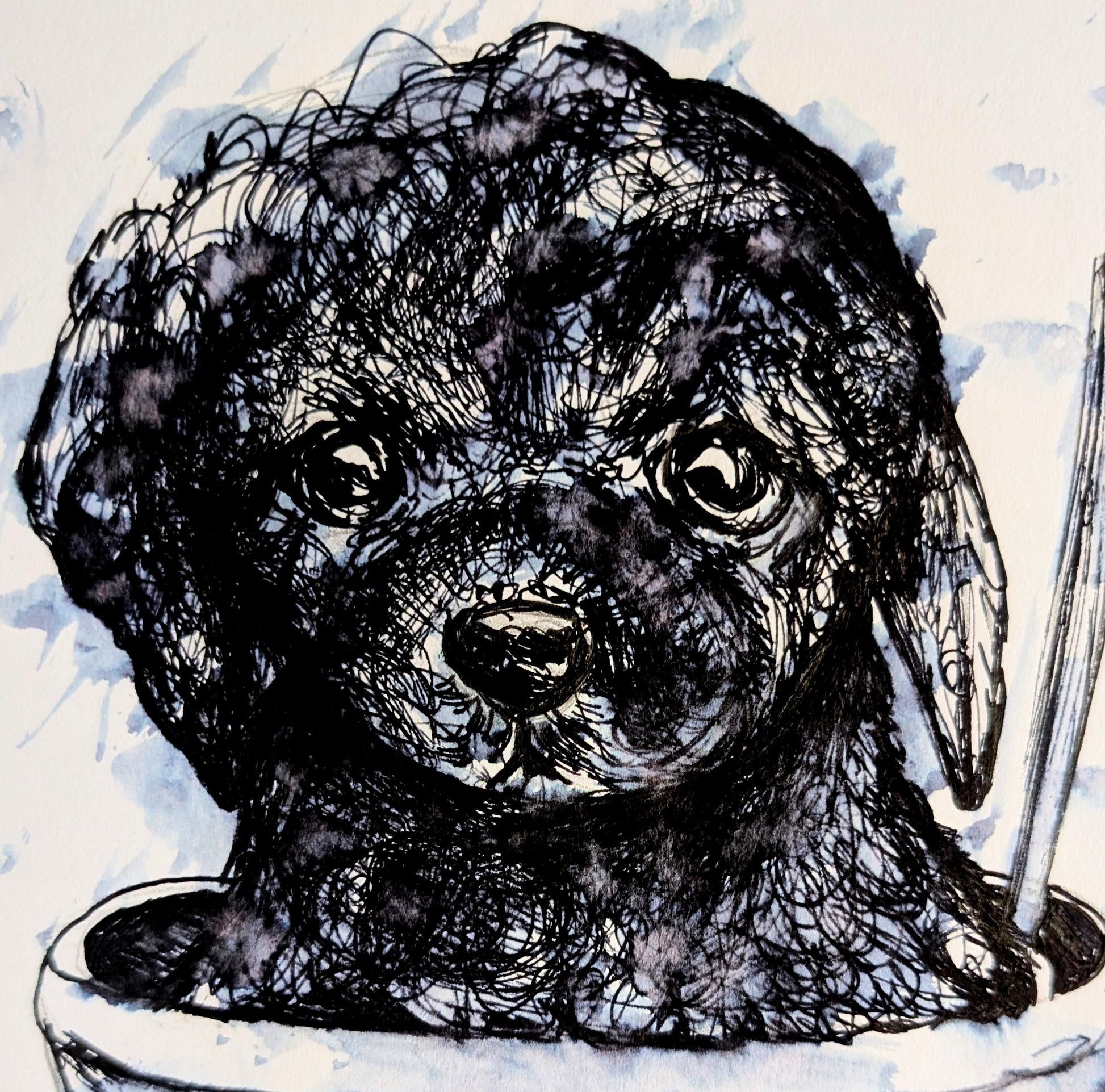 Poodle Puppy In Bowl With Spoon Paw Print Marks Pen Illustration Drawing Sketch Art Portrait Unframed A4 Size